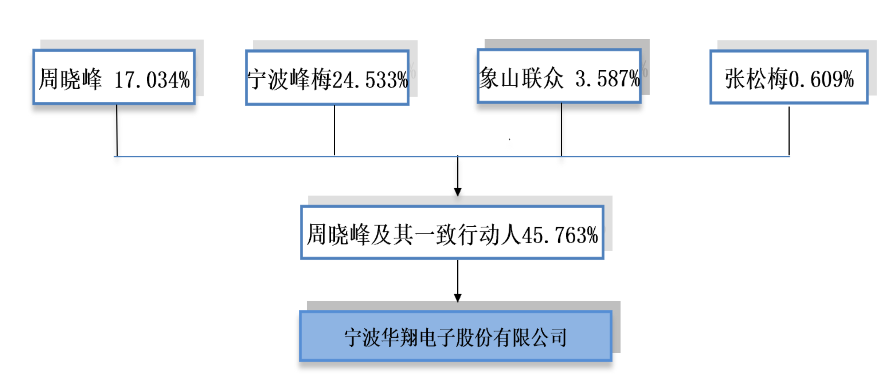 宁波峰梅由周晓峰和张松梅分别持股80%、20%。据宁波华翔2023年年报,张松梅为周晓峰的一致行动人,周晓峰及其一致行动人控制了宁波华翔约45.76%的股份。