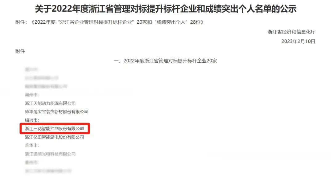 2月13日,浙江省经信厅公布了2022年度浙江省管理对标提升标杆企业名单,认定20家企业为“浙江省管理对标提升标杆企业”,三花智控荣登榜单。