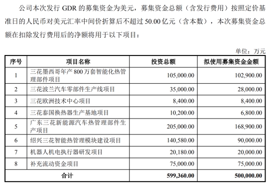 据悉,本次募集资金总额在扣除发行费用后的净额将用于三花墨西哥年产800万套智能化热管理部件项目、三花波兰汽车零部件生产线项目、三花欧洲技术中心项目、三花泰国换热器生产基地项目、广东三花新能源汽车热管理部件生产项目、绍兴三花智能热管理模块建设项目、机器人机电执行器研发项目和补充流动资金项目。