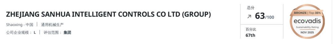近日, 三花智控 正式获得国际权威企业社会责任评级机构EcoVadis授予的铜牌认证(Copper Medal)。公司在可持续发展领域的绩效表现已位居全球受评企业前33%,环境、社会与治理(ESG)方面的管理体系与实践成果获得国际权威认可。