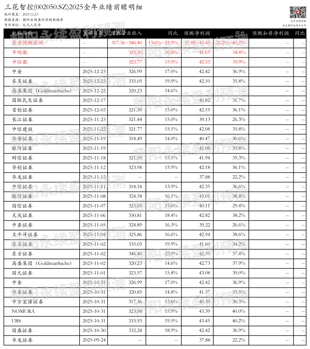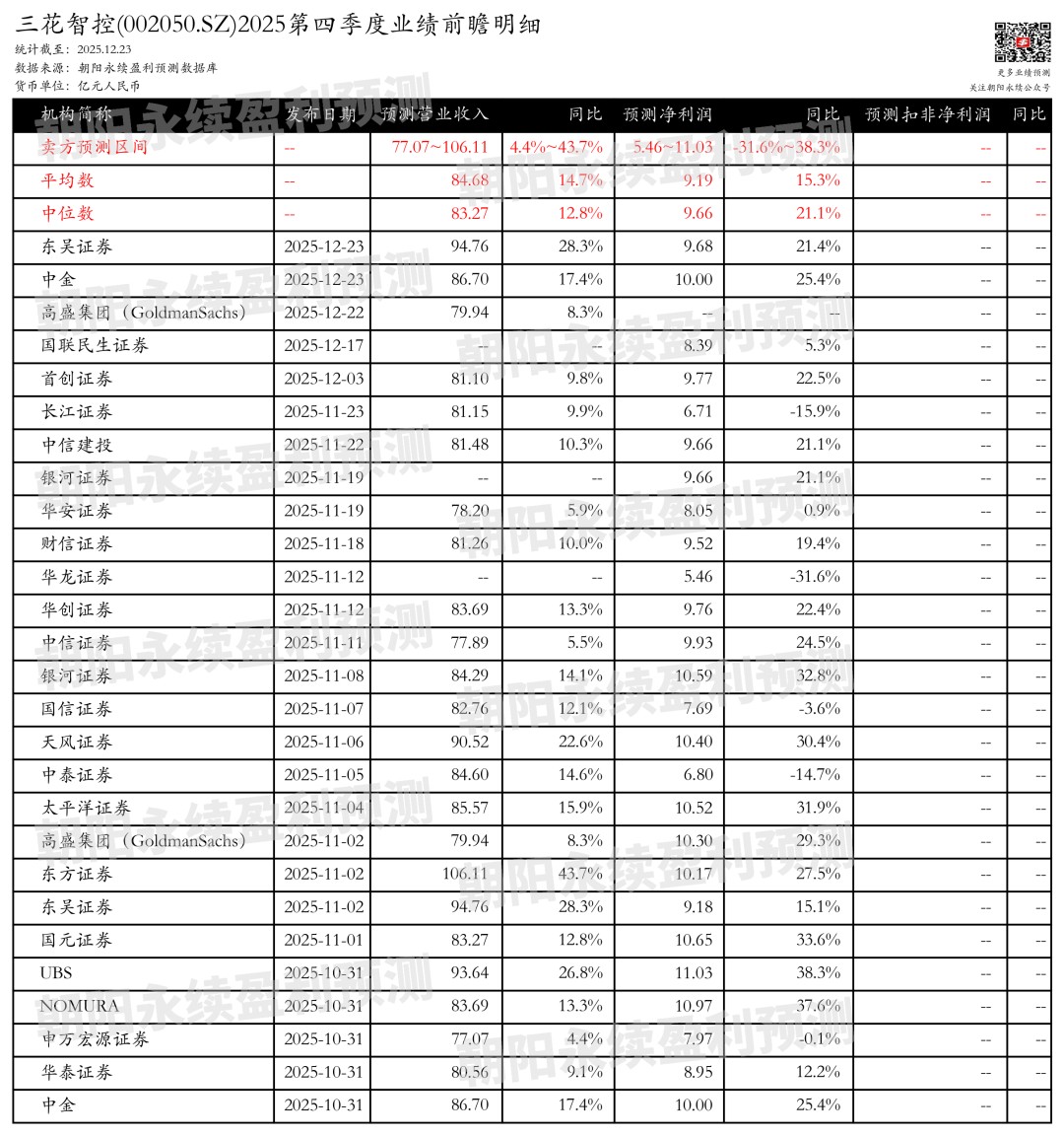 截至2025年12月23日,根据朝阳永续季度业绩前瞻数据: