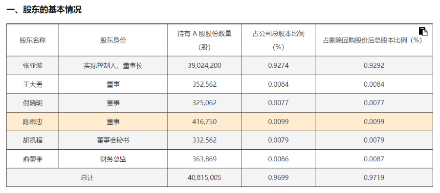 张亚波为公司实际控制人、董事长。截至公告披露日,张亚波持有公司A股股份39,024,200股,占公司总股本比例0.9274%,占剔除公司回购专用账户中股份后总股本比例0.9292%。