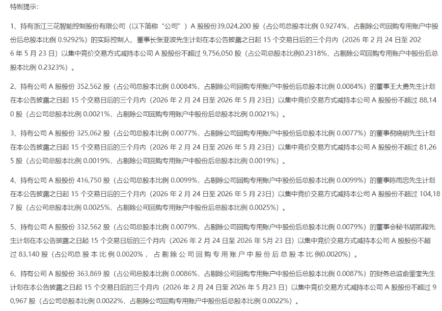 公告显示,公司实际控制人、董事长张亚波计划在公告披露之日起15个交易日后的三个月内(2026年2月24日至2026年5月23日)以集中竞价交易方式减持公司A股股份不超过9,756,050股(占公司总股本比例0.2318%,占剔除公司回购专用账户中股份后总股本比例0.2323%)。