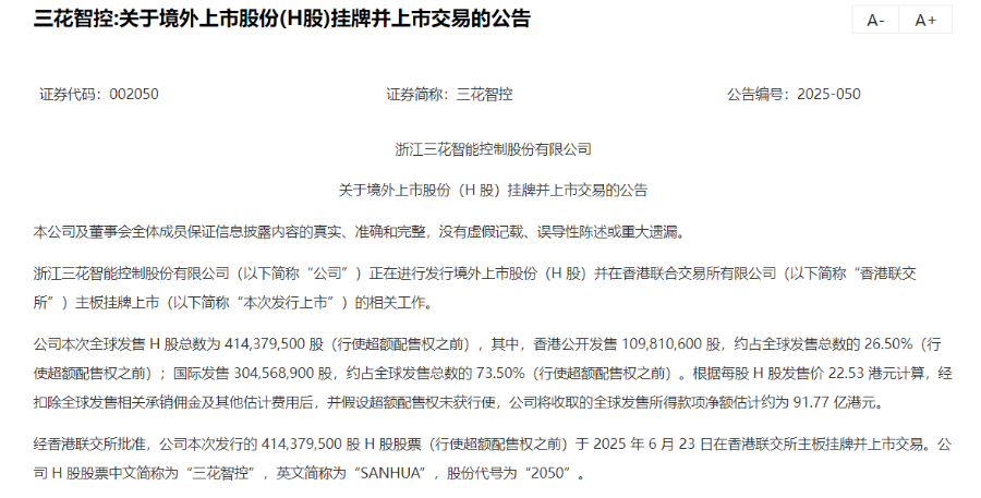 相关媒体报道显示,2025年6月23日,三花智控在港交所上市,开盘即破发,报20.95港元。三花智控的最终发售价为22.53港元,所得款项总额为9,336百万港元,扣除按最终发售价计算的预计应付上市开支159百万港元后,所得款项净额为9,177百万港元。
