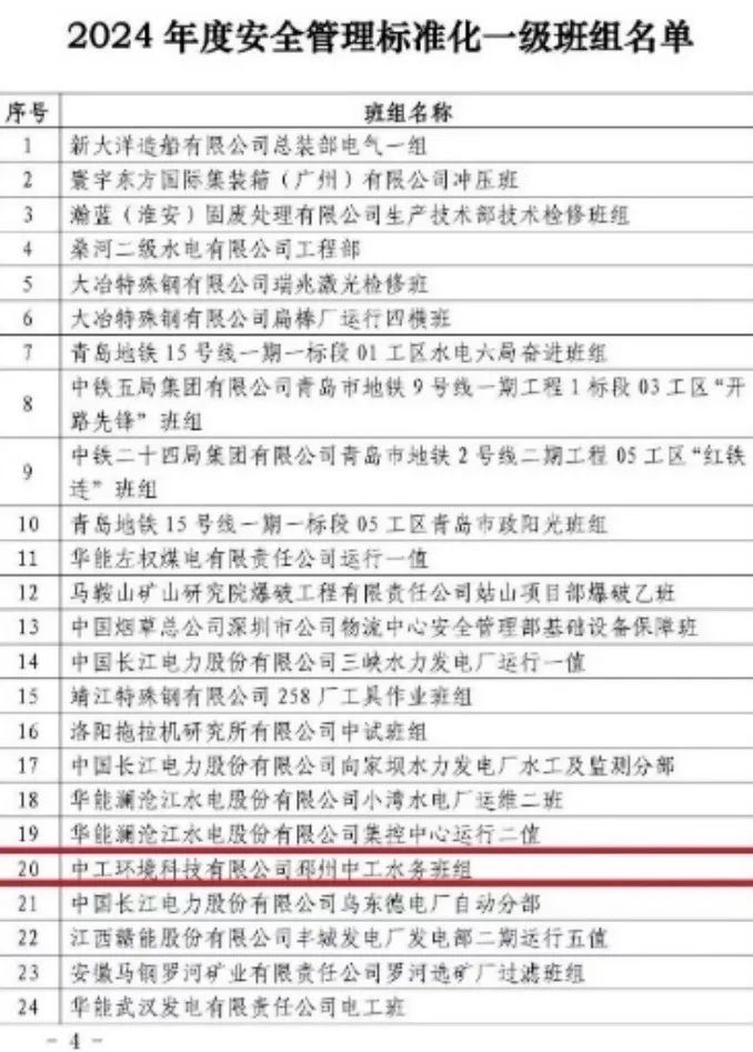 近日,由中国安全生产协会举办的2024年度安全管理标准化班组评比活动圆满落幕。经过层层选拔与严格评审,中工国际所属北起院装备制造(北京)有限公司装配班组和中工环境科技有限公司邳州中工水务班组荣获2024年度全国安全管理标准化一级班组称号。