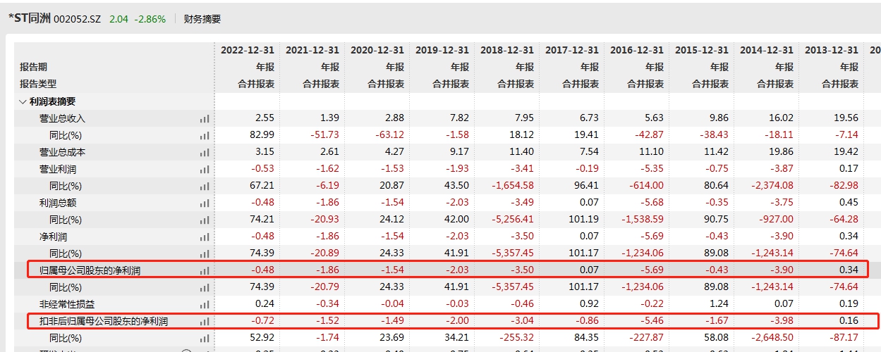 财务数据显示,近年来,*ST同洲业绩持续承压,2013年至2022年10年间,有8年出现亏损,扣非净利润更是“十年九亏”。