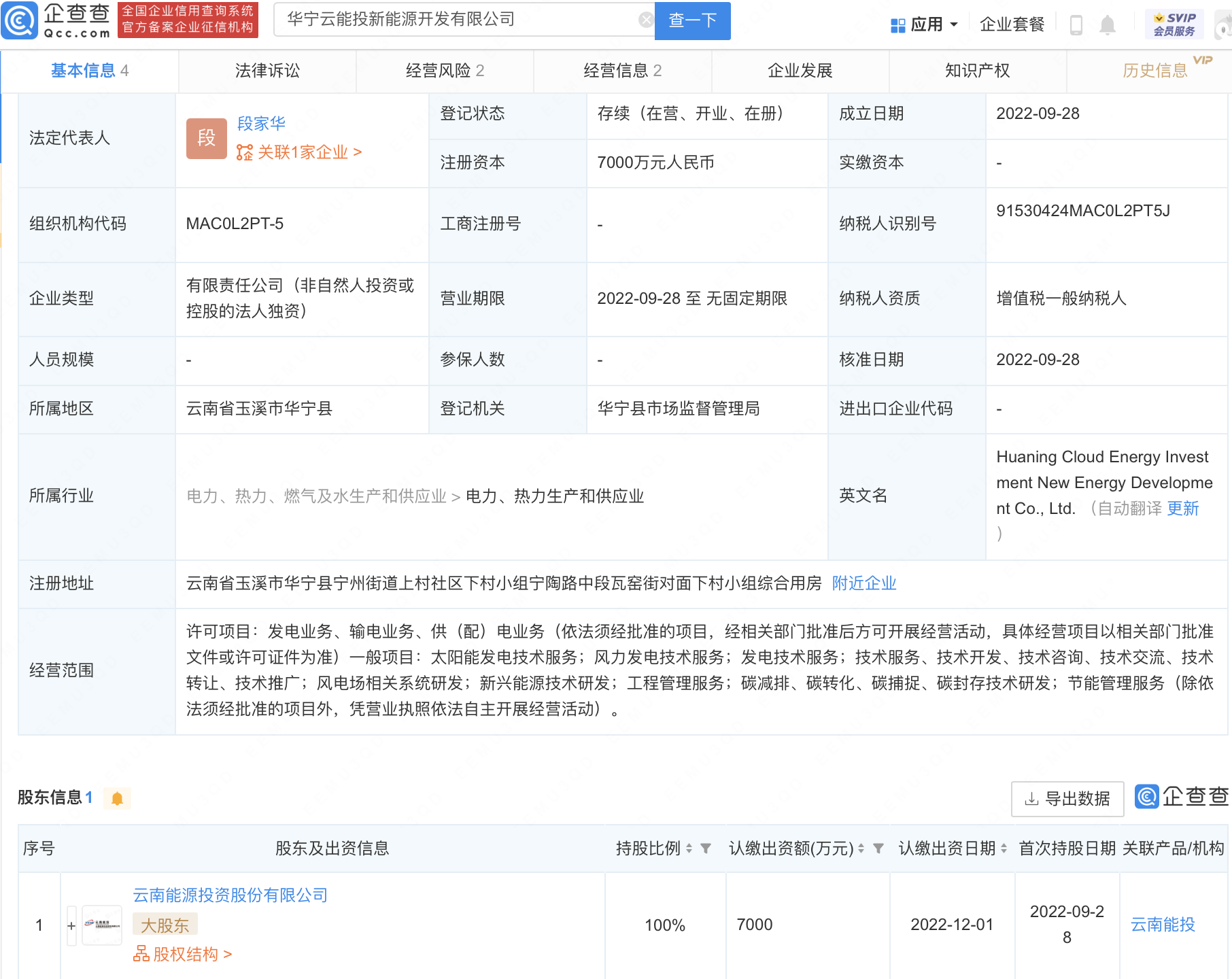 近日,华宁云能投新能源开发有限公司成立,法定代表人为段家华,注册资本7000万元人民币,经营范围包含:太阳能发电技术服务;风力发电技术服务;碳减排、碳转化、碳捕捉、碳封存技术研发等。企查查股权穿透显示,该公司由云南能投(002053)100%控股。
