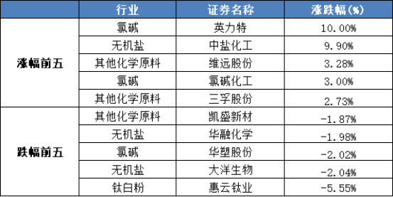 化学原料板块中涨幅前五的公司有英力特(10.00%)、中盐化工(9.90%)、维远股份(3.28%)、氯碱化工(3.00%)和三孚股份(2.73%);跌幅前五的公司分别是凯盛新材(-1.87%)、华融化学(-1.98%)、华塑股份(-2.02%)、大洋生物(-2.04%)和惠云钛业(-5.55%)。