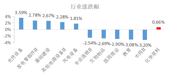 11月23日,化学原料板块上涨0.66%,沪深300上涨0.11%,化学原料板块跑赢大盘0.55pct。其中,涨幅前五板块分别是光伏设备(3.59%)、家电零部件Ⅱ(2.78%)、基础建设(2.67%)、其他电源设备Ⅱ(2.28%)和风电设备(1.81%)。