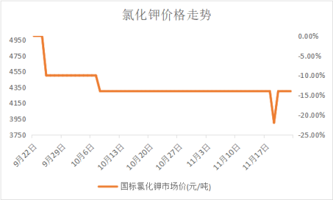 11月23日,氯化钾基准价为4300元/吨,较11月1日(4300元/吨)持平。