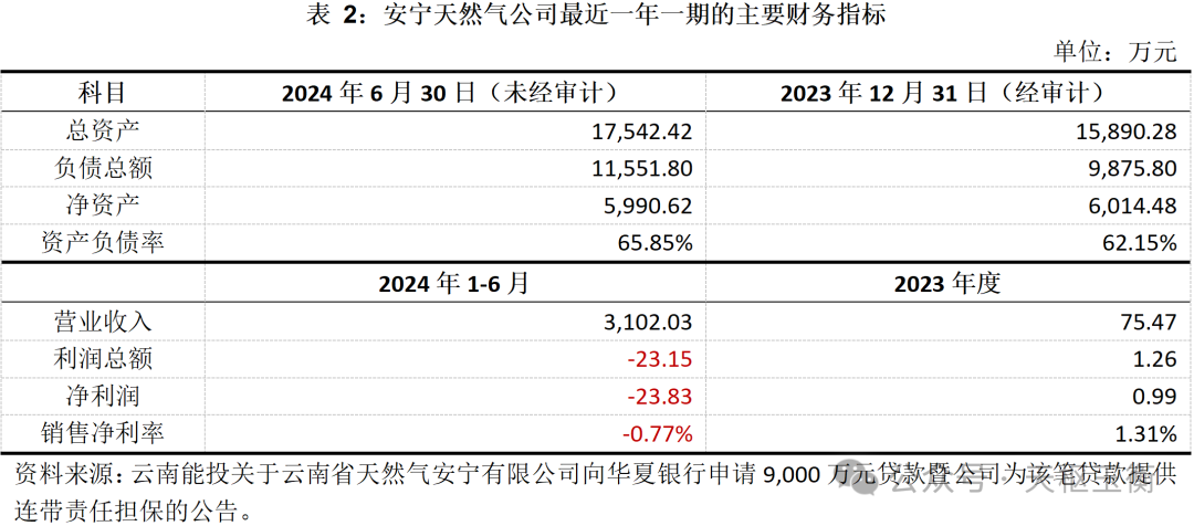 本次担保,天然气公司其他持股47.49%的股东云南能投资本投资有限公司未按出资比例提供同等担保,将按持股比例为该笔借款向公司提供反担保。安宁天然气公司最近一年一期的主要财务指标如下表所示: