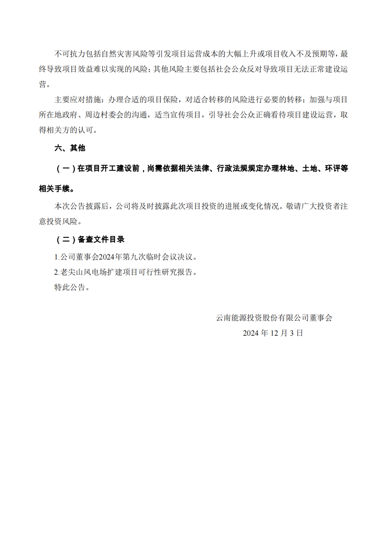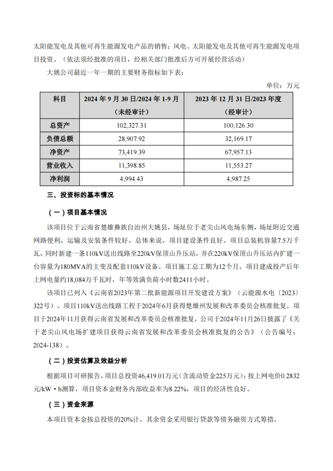 公告指出,12月2日,云南能投董事会2024年第九次临时会议通过了《关于大姚云能投新能源开发有限公司投资建设老尖山风电场扩建项目的议案》,同意全资子公司大姚云能投新能源开发有限公司(以下简称“大姚公司”)投资建设老尖山风电场扩建项目,项目总装机容量7.5万千瓦,项目总投资46,419.01万元。