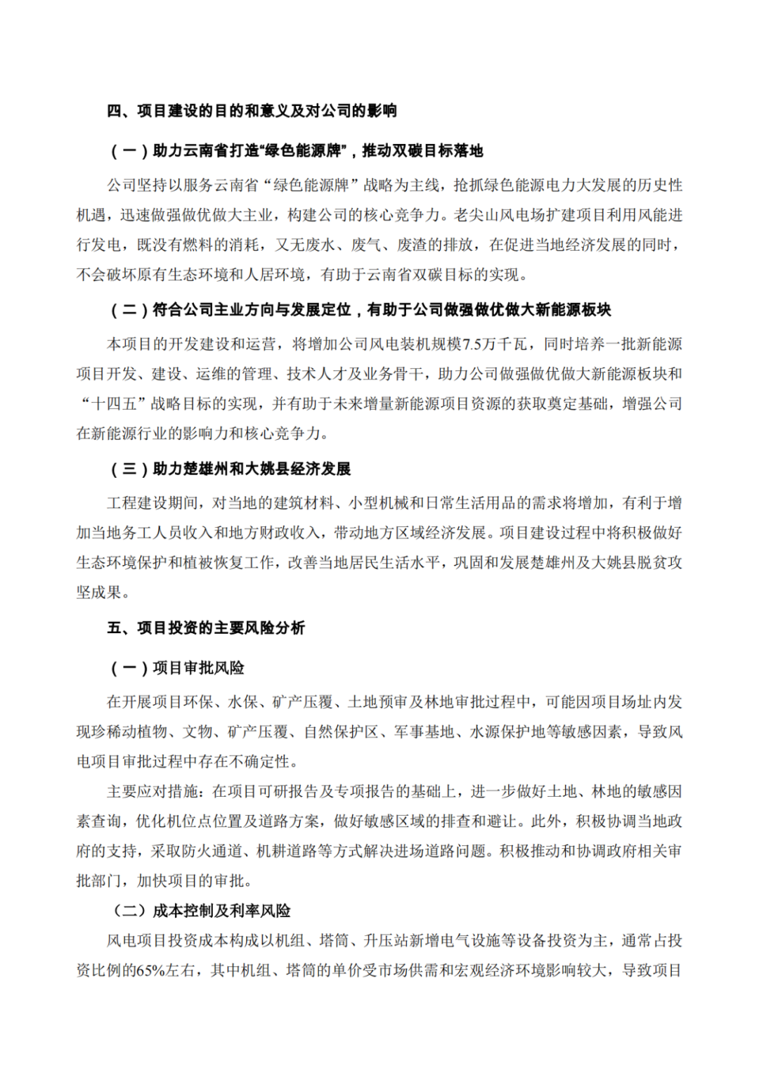 云南能投表示,公司坚持以服务云南省“绿色能源牌”战略为主线,抢抓绿色能源电力大发展的历史性机遇,迅速做强做优做大主业,构建公司的核心竞争力。老尖山风电场扩建项目利用风能进行发电,既没有燃料的消耗,又无废水、废气、废渣的排放,在促进当地经济发展的同时,不会破坏原有生态环境和人居环境,有助于云南省双碳目标的实现。