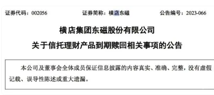 但截至公告披露日,横店东磁所购3亿元国通信托产品已收回1375万元,其余可能存无法按期兑付或全额兑付风险。