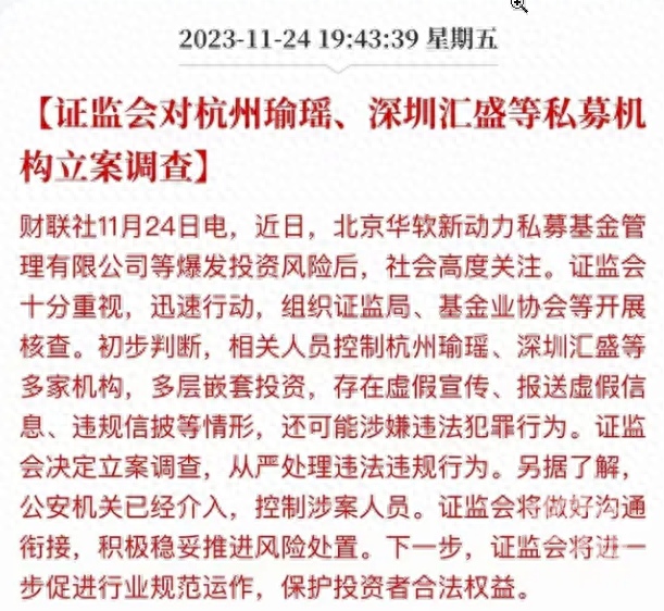 11月24日晚,证监会表示,对涉事方杭州瑜瑶、深圳汇盛等私募机构进行立案调查,从严处理违法违规行为。另据了解,公安机关已经介入,控制涉案人员。证监会将做好沟通衔接,积极稳妥推进风险处置。下一步,证监会表示,将进一步促进行业规范运作,保护投资者合法权益。