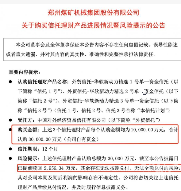 11月19号,郑煤机率先公告投资3亿元目前仅收回2956.34万元。