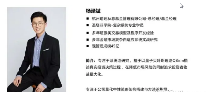 而根据杭州瑜瑶的推介材料显示,杭州瑜瑶目前实际控制人、公司量化中性策略的基金经理杨泽斌,拥有吉林大学系统工程本科学历,浙江大学金融研修班在读,曾经是美国圣塔菲研究所学员,并拥有7年证券类交易模型及程序开发经验,现管规模达到35亿元。