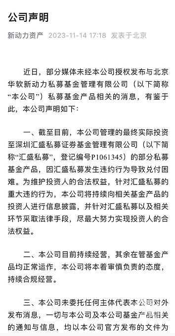 时间倒回11月14日,一则“杭州私募造假跑路,引发百亿FOF私募华软新动力踩雷”的信息,在私募圈引发广泛关注。当日晚间,华软新动力发布声明称,截至目前,公司管理的最终实际投资至深圳汇盛的部分私募基金产品,因汇盛私募发生违约行为导致兑付困难。为维护投资人的合法权益,针对汇盛私募的重大违约行为,公司将持续向相关基金产品的投资人进行信息披露,并针对汇盛私募以及相关环节采取法律手段,尽最大努力实现投资人的合法权益。