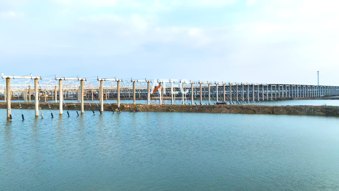 跨度40米,净空不小于4米,采用“渔光互补”模式,充分利用渔塘水域面积,将光伏发电和渔业养殖结合起来,形成“水上发电、水下养殖”的复合产业模式,打造清洁能源发展的“新样本”。