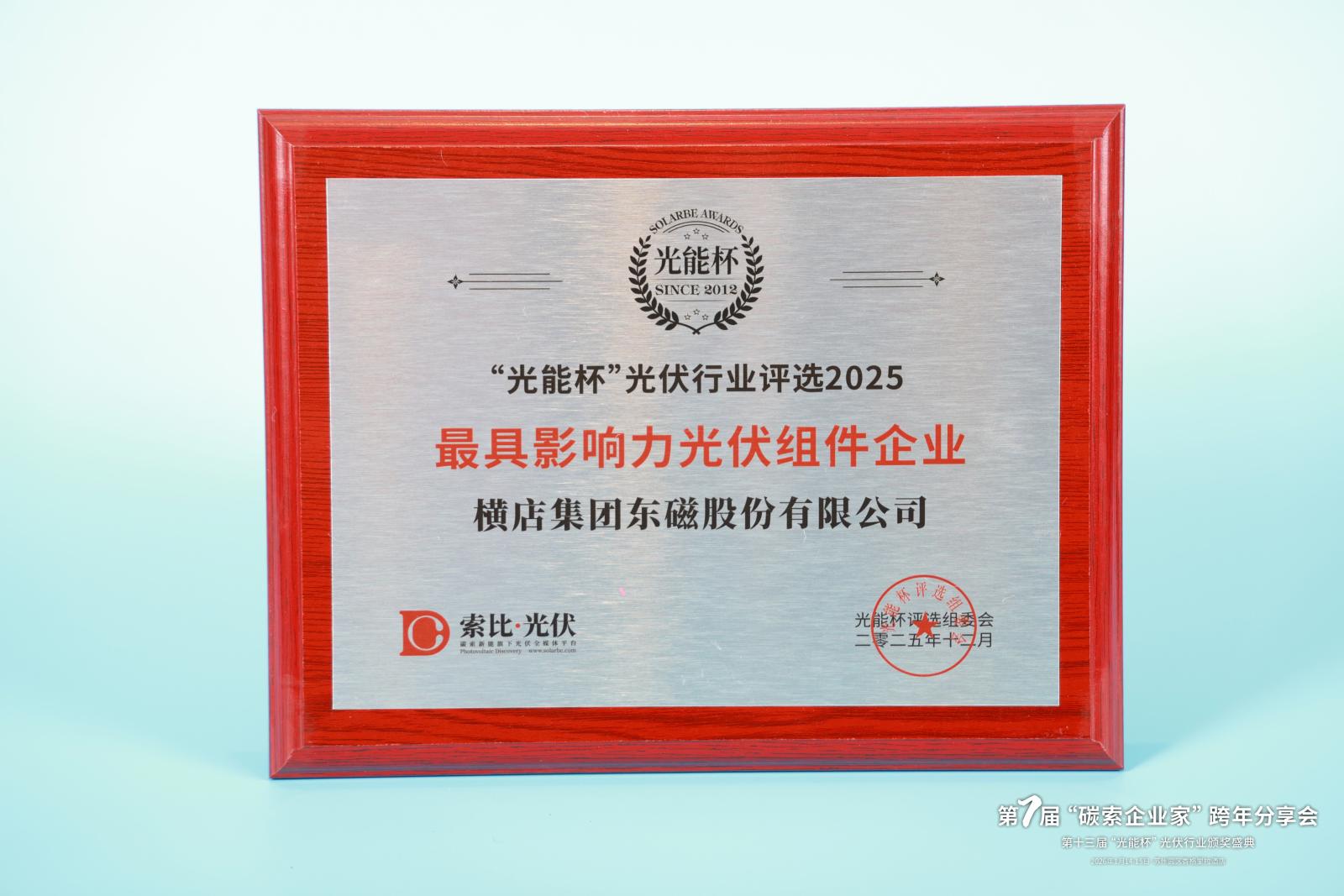 本届“光能杯”共有300余家光伏企业参与报名评选,角逐年度荣誉。此次颁奖盛典中,横店集团东磁股份有限公司凭借强大创新力、出色的品质与服务、卓越的品牌影响力,荣膺2025年度最具影响力光伏组件企业。