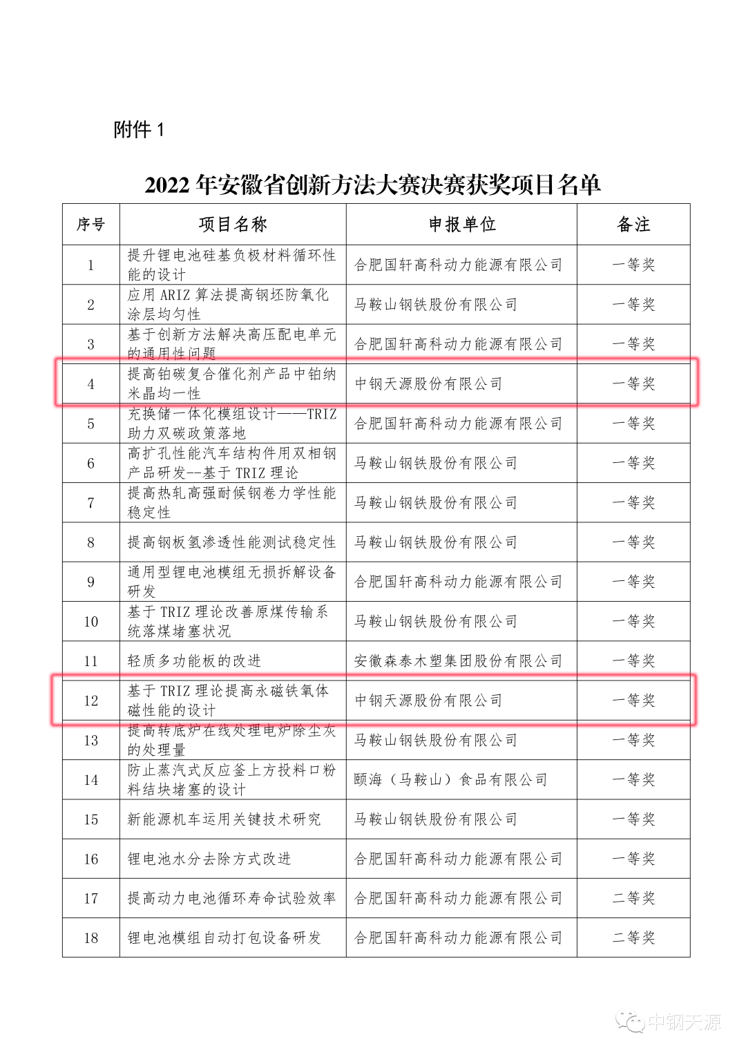 近日,由安徽省科协、安徽省科技厅举办的2022年安徽省创新方法大赛决赛落下帷幕,中钢天源选派的《提高铂碳复合催化剂产品中铂纳米晶均一性》、《基于TRIZ理论提高永磁铁氧体磁性能的设计》两个项目从决赛23个项目中脱颖而出,双双斩获大赛一等奖,其中《提高铂碳复合催化剂产品中铂纳米晶均一性》项目作为全省7个项目之一将代表安徽省参加2022年中国创新方法大赛总决赛。