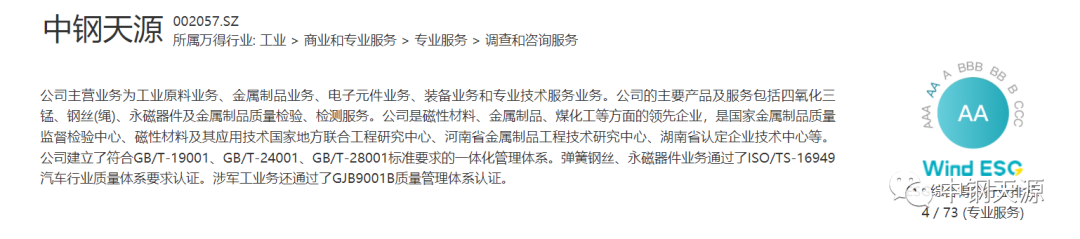 近日,中国金融信息服务机构Wind(万得)发布了2022年度A股上市公司ESG评级榜单。中钢天源评级已由2022年的BBB级跃升至AA级,在目前参评的73家专业服务企业中排名第4位,践行ESG发展理念初显成效。