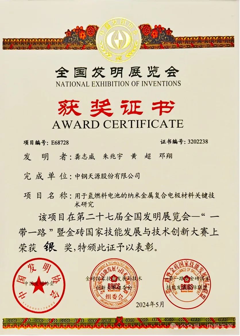 近日,第二十七届全国发明展览会—“一带一路”暨金砖国家技能发展与技术创新大赛落下帷幕,大会深入贯彻落实习近平总书记关于科技创新的重要论述,立足新发展阶段,贯彻新发展理念,构建新发展格局,以“创新链与产业链共生人才与城市共荣”为主题,集中展示我国优秀科技成果和职业技能水平,来自全国各地的700多家企业和科研机构参展,1587个发明创新项目亮相。中钢天源“用于氢燃料电池的纳米金属复合电极材料关键技术研究”项目在全国众多参选项目中脱颖而出,斩获银奖。参展期间,中钢天源作为受邀参加主题论坛的企业代表,在会上分享发明成果,展示研发实力,获得与会人员广泛认可与好评。