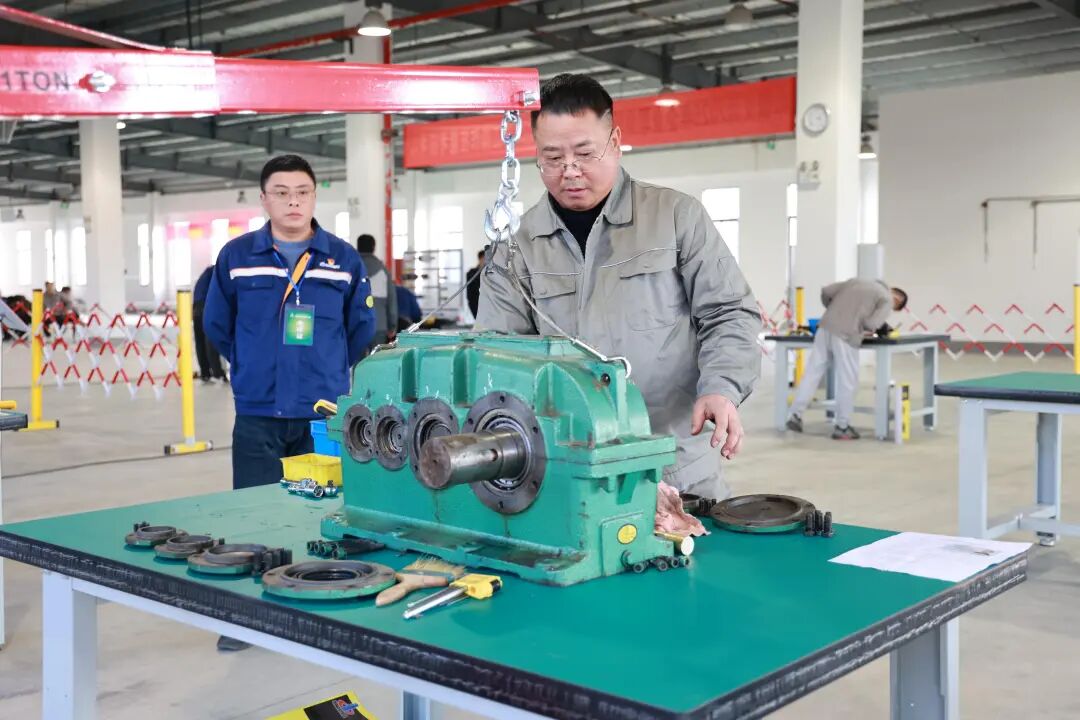 实操考核区则是一片热火朝天的竞技景象,考生们身着工装,精神抖擞,纷纷亮出看家本领。只见桥式起重机司机操作着行车,吊桶在绕杆间轻盈游走,精准落点至指定圈内,物料稳如泰山。电工指尖翻飞,剥线、压接一气呵成,接触器联锁线路排布规整,电机正反转切换流畅。钳工使用工量器具,一丝不苟拆卸、清洗、测量、安装,柱塞泵、减速机被逐步拆分后又精准复原。