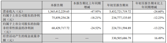 去年第三季度,公司实现营业收入1,365,412,229.65元,同比减少47.95%;实现归属于上市公司股东的净利润75,859,254.28元,同比减少18.21%;实现归属于上市公司股东的扣除非经常性损益的净利润68,429,717.72元,同比减少24.52%。