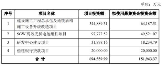 昨日,宏润建设发布2023年度非公开发行股票预案。本次发行拟募集资金总额不超过151,943.37万元(含本数),扣除发行费用后,本次发行募集资金净额将全部用于建设施工工程总承包及地铁盾构施工设备升级改造项目、5GW高效光伏电池组件项目、研发中心建设项目、偿还银行贷款项目。