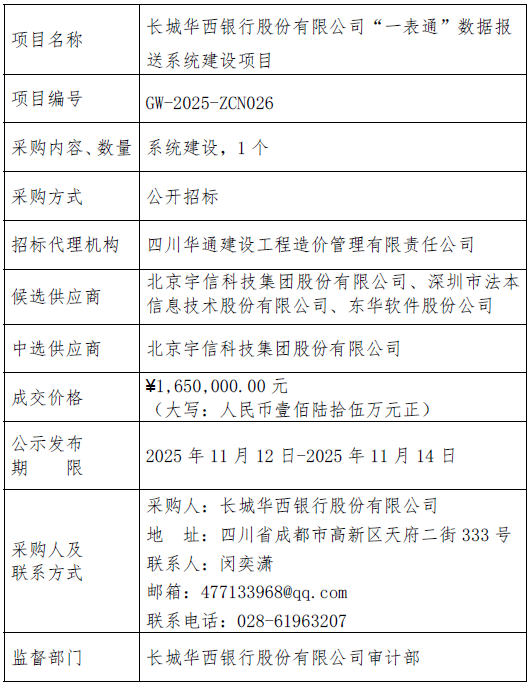 宇信科技165万中,法本信息、东华软件候选!长城华西银行“一表通”数据报送系统建设项目