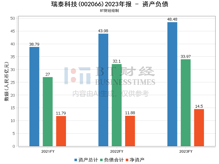 在资产负债方面,瑞泰科技2023年年末总资产为48.48亿元,较年初的43.98亿元增长了10.22%。负债总额在年末达到了33.97亿元,相比年初的32.1亿元有所上升。净资产从年初的11.88亿元增长到年末的14.5亿元。资产负债率从年初的73%下降到年末的70.08%,显示出公司财务结构有所优化。