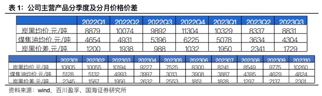 2023Q3,公司实现营业收? 23.70亿元,同?-10.53%,环?+6.90%;实现归?净利润-0.27 亿元,同?+11.47%,环?减亏 79.55%。2023Q3,在上游原料煤焦油价格温和上涨,及下游轮胎国内外需求提升的背景下,公司主营产品炭?盈利能?增强,业绩环?改善。据百川盈孚,2023Q3,炭?均价为 8831元/吨,环?上涨 494元/吨,价差为 1729 元/吨,环?下跌 612 元/吨。?季度,由于上游煤焦油价格?幅下跌,波动较?,因此,尽管三季度价差环?略有收窄,但公司炭?盈利能?仍提升,2023Q3单季度销售?利率为 3.79%,同?增加 1.95pct,环?增加 5.93pct。10 ?,炭?及价差仍在温和上涨,预计四季度业绩改善趋势有望持续。