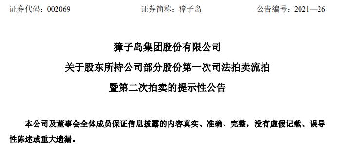 据股民110网消息,獐子岛(獐子岛,002069)在2021年6月17日发布了《关于股东所持公司部分股份第一次司法拍卖流拍暨第二次拍卖的提示性公告》。公告内容显示,被执行人持有的獐子岛( 002069)合计5,879.99万股股份,分别于2021年6月9日至6月10日、6月11日至6月12在拍卖网络平台上进行第一次公开拍卖结果为流拍。现将进行第二次公开拍卖,拍卖时间为2021年6月28日至29日,7月1日至2日公分六笔分别在网络平台进行拍卖。