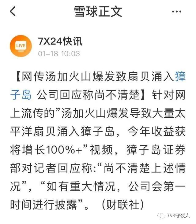 1月18日,獐子岛回复称,公司关注最近有媒体报道“汤加火山喷发和海啸导致太平洋扇贝涌入獐子岛今年收益获将增长100%+”及相关传闻,上述报道及传闻严重失实,公司管理层未接受上述问题的任何相关采访、回复,公司保留通过法律途径保护自身权益的权利。
