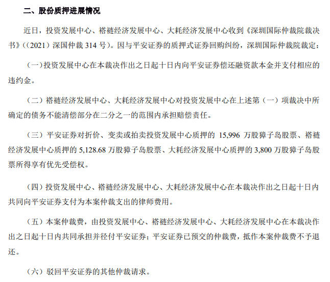 去年10月15日,獐子岛就披露了此事的进展。3名股东因与平安证券的质押式证券回购纠纷收到了《深圳国际仲裁院裁决书》,要求向平安证券偿还融资款本金并支付相应的违约金并承担赔偿责任。