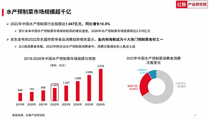 此前红餐产业研究院发布的《中国水产预制菜研究报告2023》表示,水产靠预制菜实现全年长红。报告显示,2022年中国水产预制菜行业规模达1047亿元,同比增长16.8%,预计未来中国水产预制菜市场将保持较高的增长速度,2026年水产预制菜市场规模将达2576亿元。