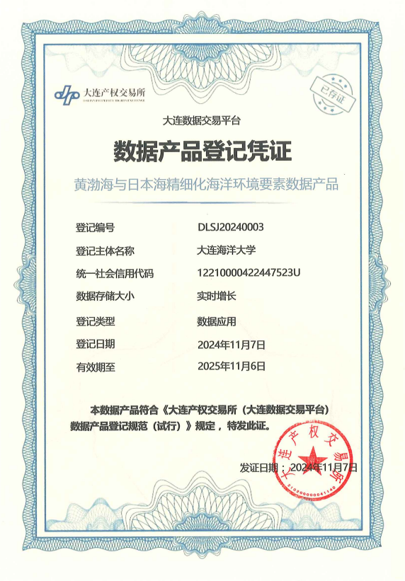 据悉,此次交易的数据产品为大连海洋大学多年积累与研发的“黄渤海及日本海精细化海洋环境要素数据产品”。该数据产品经过严格的质量控制、安全与合规审查,并利用数值模式、深度学习等技术手段,确保了数据产品的准确性、安全性和可交易性。该数据产品已在大连市数据交易平台完成登记,2024年11月获得了辽宁省首张海洋数据产品登记证书。