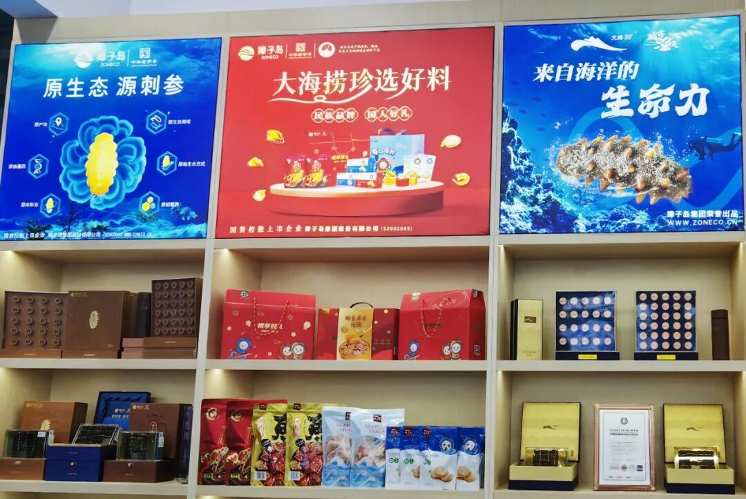 獐子岛地处北纬39°,是国家级海洋牧场示范区,也是中国海珍品原产地。这里地理、气候和海域自然条件优越,水温低、盐度高、饵料充足、营养丰富、海域开放、远离大陆。凭借独有的地理区位与水质环境,实现了刺参、鲍鱼、扇贝、海胆、海螺、生蚝、鱼类、藻类等生物多样性价值。在獐子岛集团展位,鲍鱼、扇贝、海螺、生蚝、紫石房蛤等原产地活鲜品均刻有或挂有“獐子岛”品牌,打造差异化产品体验,强化消费者对高端海珍品溯源和獐子岛品牌的全新认知。