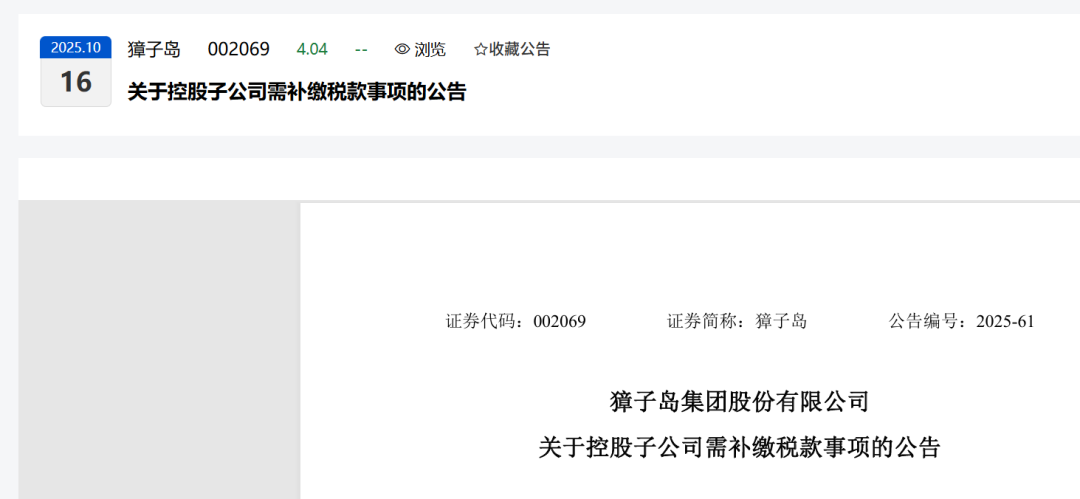 獐子岛集团股份有限公司(以下简称“公司”)控股子公司青岛前沿海洋种业有限公司(以下简称“青岛前沿海洋”)近日收到国家税务总局青岛市崂山区税务局出具的《税务事项通知书》(青崂税通【2025】5900号、5525号、5542号、5543号),核定青岛前沿海洋2019-2021年度合作育苗业务所得不符合《中华人民共和国企业所得税法实施条例》第八十六条“海水养殖所得减半征收企业所得税”的规定,要求青岛前沿海洋补缴2019-2021年度企业所得税1,063.51万元,滞纳金872.31万元。另外,青岛前沿海洋按照上述主管税局签发的《税务事项通知书》(青崂税通【2025】4016号)和《责令限期改正通知书》(青崂税限改【2025】20号)先行补缴2022年度企业所得税155.73万元,滞纳金62.75万元。截止本公告披露日,上述税款及滞纳金已全部缴纳完毕。