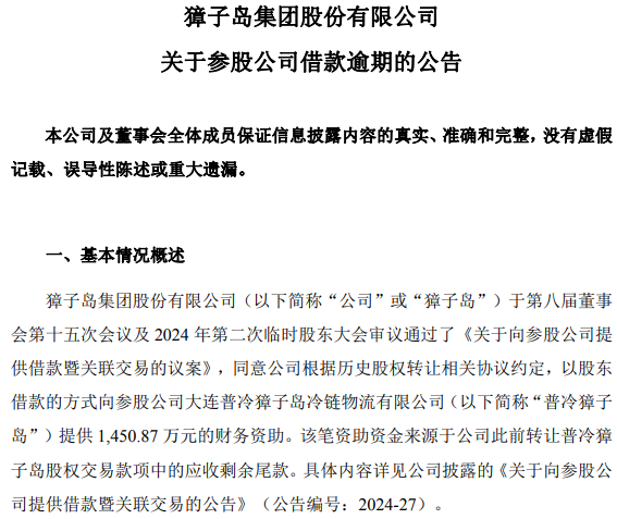 协议约定,普冷獐子岛应于借款到期日一次性偿还全部本金及相应利息。若发生逾期,则自逾期之日起,以逾期金额为基数,按每日万分之一的标准计收罚息。截至公告披露日,普冷獐子岛未能按照约定归还上述借款的本金及相应罚息,已构成借款逾期。獐子岛董事会及管理层已正式向普冷獐子岛发出相关催款函。