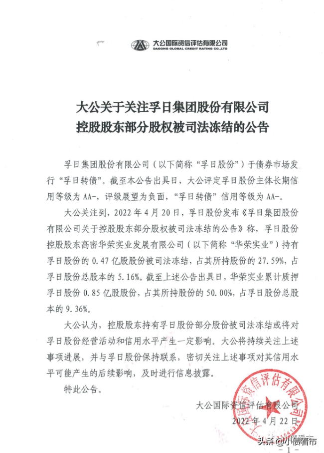 随后,大公国际公告称控股股东股份被司法冻结,或将对孚日股份经营活动和信用水平产生一定影响。