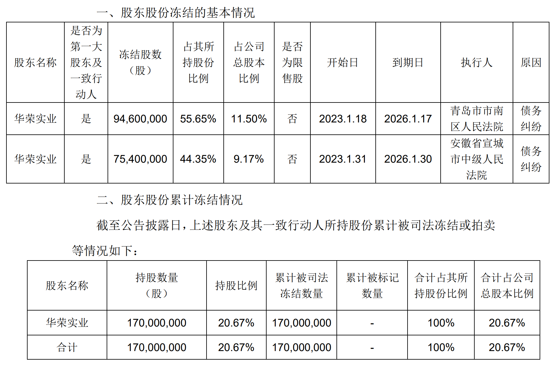 截至公告披露日,孚日股份控股股东华荣实业持有公司股份1.7亿股(占公司股份总数的20.67%),累计被司法冻结数量为1.7亿股(占其持有公司股份比例的100%)。