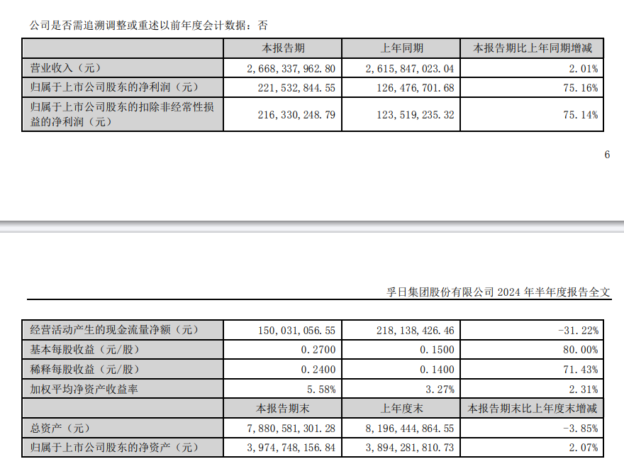 2024年上半年,孚日股份营业收入为26.68亿元,同比增长2.01%;归属于上市公司股东的净利润2.22亿元,同比增长75.16%。