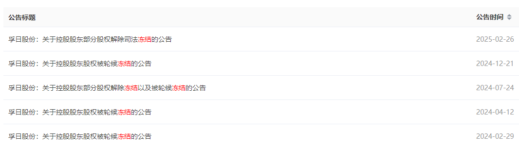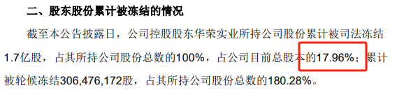 每经资本眼专栏记者注意到,孚日股份近一年频繁发布控股股东股权被司法冻结的公告。而最新的公告显示,公司控股股东华荣实业所持公司股份累计被司法冻结 1.7亿股,占其所持公司股份总数的100%,累计被轮候冻结3.06亿股,占其所持公司股份总数的180.28%。