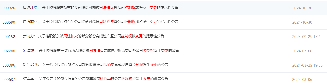 而每经资本眼专栏记者也发现,A股也存在不少因为控股股东股份被司法拍卖而面临控制权丧失风险的案例。
