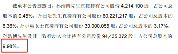 而截至3月21日,孙浩博先生直接持有公司股份421.41万股,孙日贵先生直接持有公司股份6022.12万股;孙小惠女士直接持有公司股份3000万股;孙浩博先生及其一致行动人合计持有公司股份9443.54万股,占公司2024年三季度末总股本7.83亿股的12.06%。值得注意的是,孚日股份3月21日的公告中显示孙浩博先生及其一致行动人合计持股比例写为9.98%,和记者计算的总股本比例相差较大。
