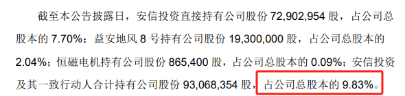 而根据公司的多项公告显示,孙日贵、孙浩博和孙小惠构成一致行动人关系(以下简称“孙日贵一方”),而安信投资与北京益安资本管理有限公司-益安地风8号私募证券投资基金(以下简称“益安地风8号”)、山东恒磁电机有限公司(以下简称“恒磁电机”)构成一致行动关系(以下简称“安信投资一方”),上述两路人马未被认定为一致行动人关系。