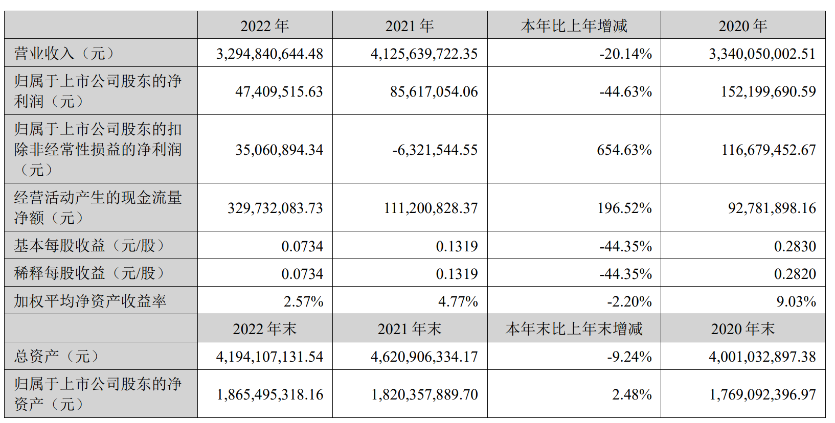 公告显示,公司实现营业收入32.95亿元,比去年同期下降20.14%;实现归属于上市公司股东的净利润4740.95万元,比去年同期下降44.63%。