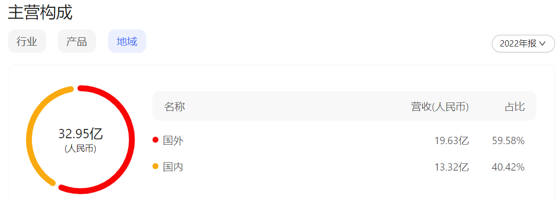 《每日经济新闻》记者注意到,从海鸥住工产品的区域划分来看,来自国外的营收为19.63亿元,占比59.58%;国内贡献营收为13.32亿元,占比40.42%。